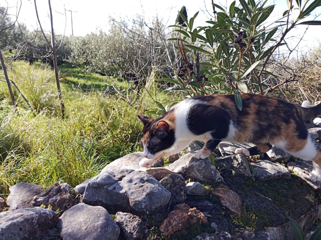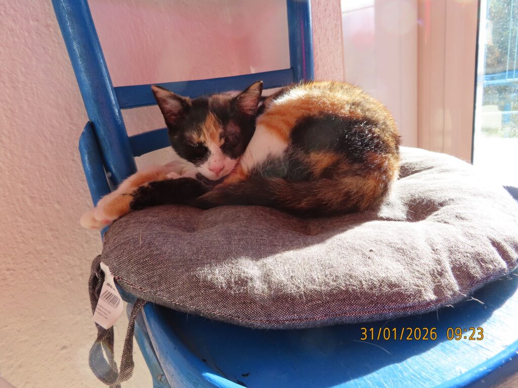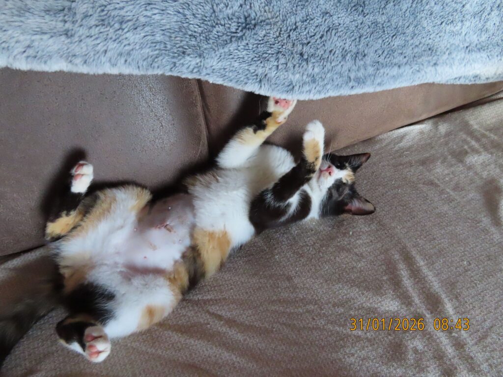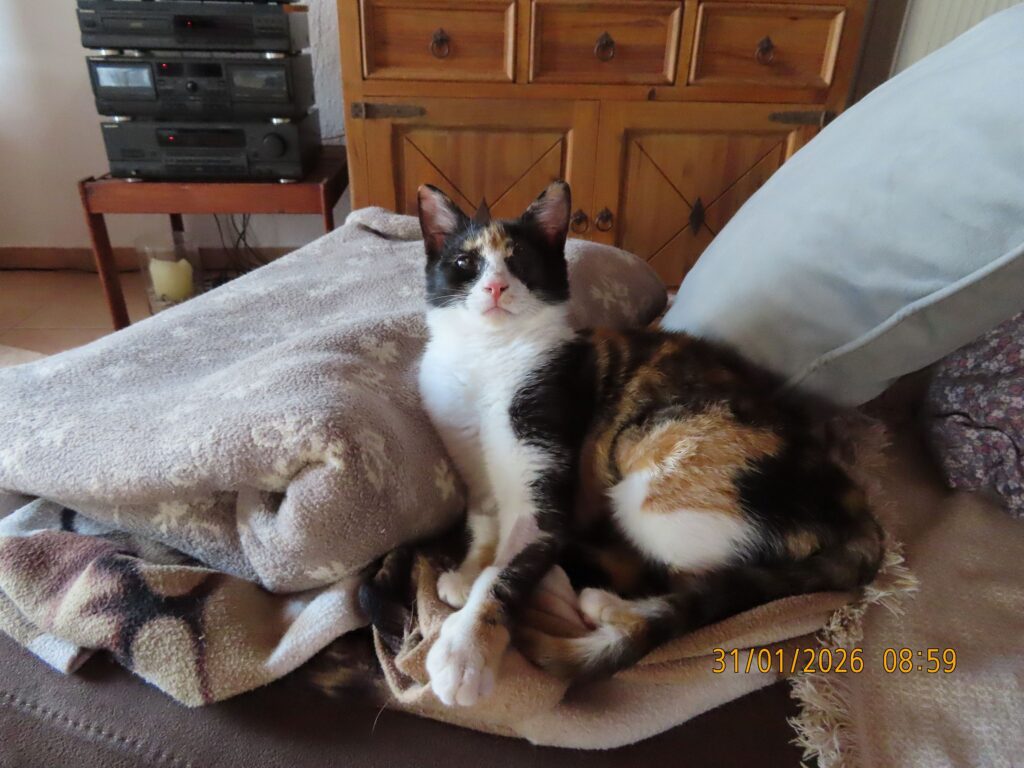 Sie ist im September 2025 geboren und wurde Ende Januar 2026 sterilisiert; ist bereits geimpft und gechipt. Ein Auge wurde zugenäht, das andere Auge wurde gereinigt und die Nickhaut etwas gekürzt damit sie ein bisschen mehr sieht. Sie spielt bei uns im Garten mit anderen Katzen, klettert auf Bäume und Mauern und genießt ihr Leben. Nachts schläft sie im Haus und bei uns im Bett. Mit unserem kleinen Hund hat sie auch keine Probleme.
